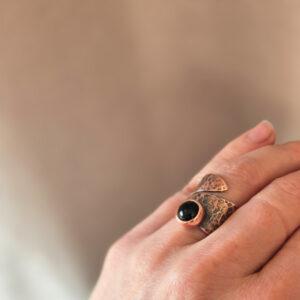 Użyte materiały: fasetowany turmalin, onyks, hematyt, metalowe elementy ozdobne